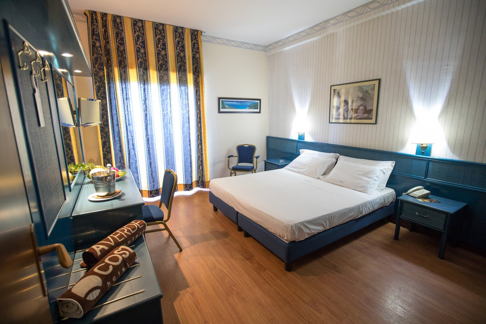 Camera Comfort: Arredo moderno, fresco ed estivo in un’atmosfera luminosa e accogliente. Ampio balcone arredato con sedie e tavolo con vista sui dintorni dell’hotel. Cassaforte, Frigo, TV satellitare, presa USB, Wi-fi open, Phon. Occupazione 1-4 persone