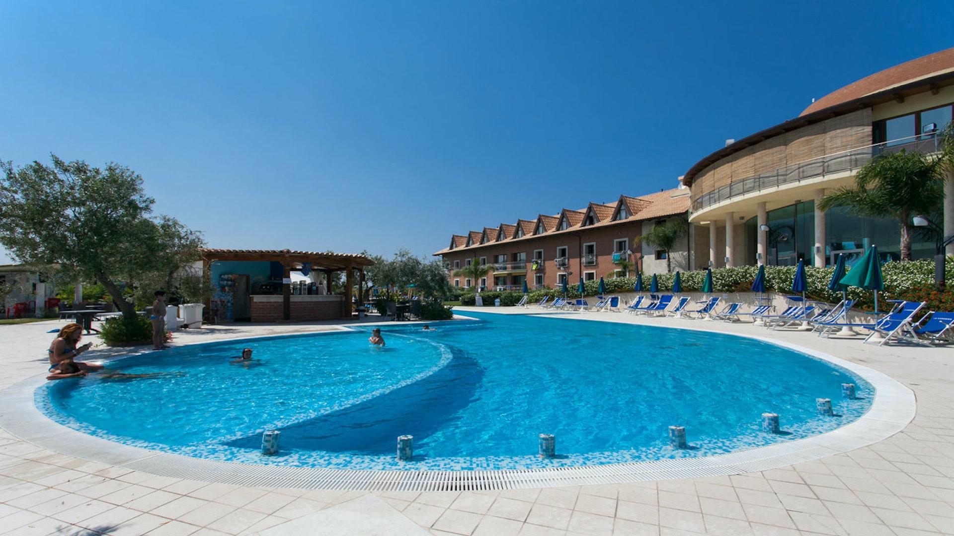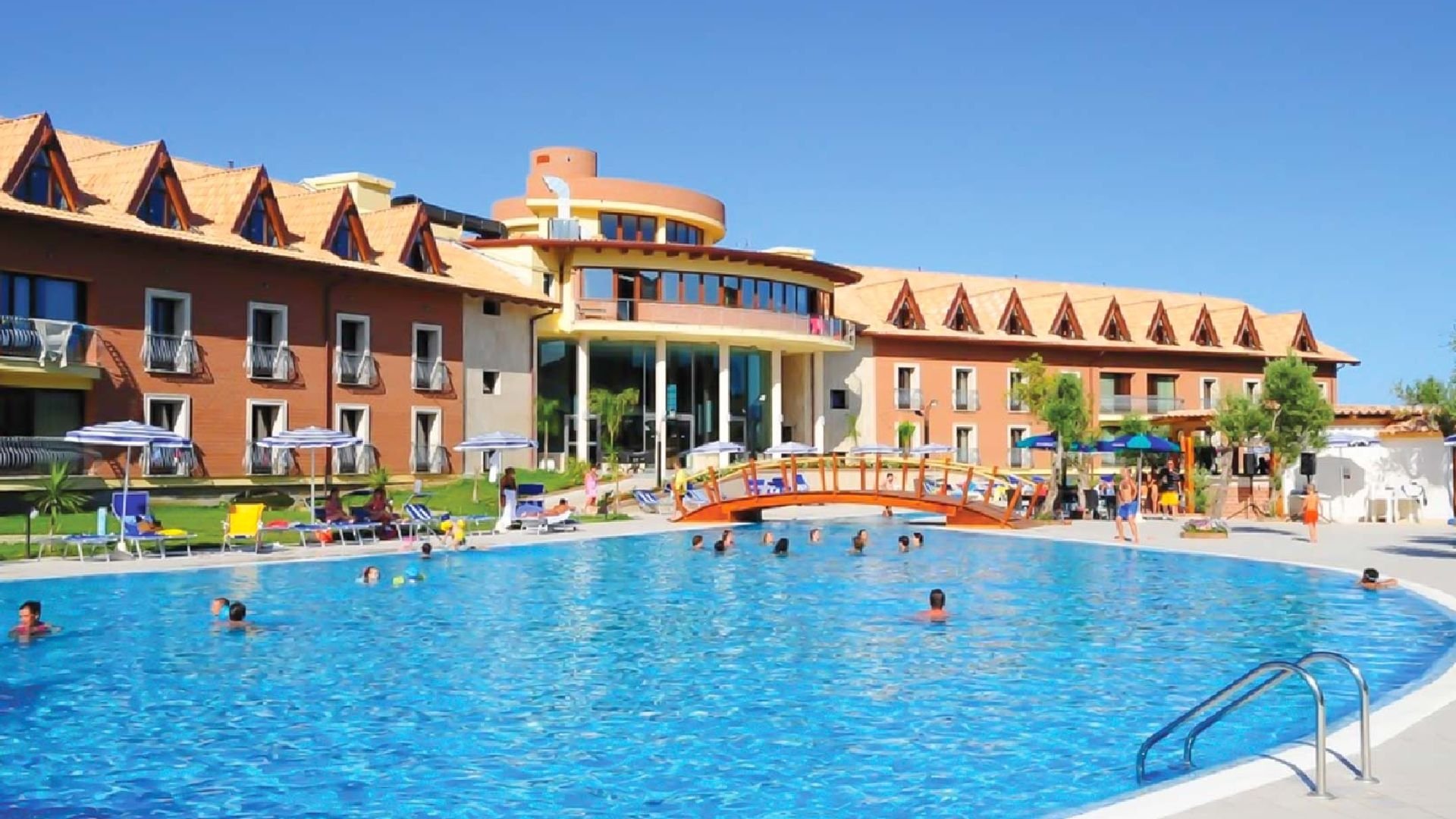 DESCRIZIONE E SERVIZI: è composta da un nuovissimo ed elegante Hotel “ZEUS” di 104 camere su tre piani e dall’Hotel “GIUNONE “con 44 camere. CAMERE: eleganti e molto confortevoli; tutte dispongono asciugacapelli, telefono, TV, cassaforte, minifrigo non attrezzato. Si dividono in: ZEUS: Camere Standard, doppie, triple, quadruple (4° letto a castello) distribuite tra piano terra, primo piano e piano mansardato (assegnazione a discrezione della Direzione in base alla disponibilità). Servizi con vasca nelle camere del piano terra e primo piano, box doccia nelle camere dell'ultimo piano. Camere Comfort (doppie, triple, quadruple e quintuple), molto confortevoli, di dimensioni doppie rispetto alle camere standard e dotate di balcone. Al piano terra e primo piano sono quadruple con possibilità di 5° letto su richiesta, bagno con doccia idromassaggio. All’ultimo piano sono doppie/triple con bagno con vasca idromassaggio. Camere Comunicanti (su richiesta) ubicate in mansarda e costituite da 2 camere comunicanti con 2 servizi (occupazione 4/6 persone). Per le camere comunicanti viene richiesto pagamento minimo 4 quote intere + eventuale 5°/6°letto (su richiesta) con riduzioni da tabella. GIUNONE: Camere Standard, (doppie, triple, quadruple con 4° letto a castello), dotate di servizi privati con box doccia. Bicamere (triple, quadruple e quintuple) costituite da 2 camere con unico servizio con box doccia, atte ad ospitare su richiesta fino a 5 persone. Le camere del piano terra e primo di entrambi gli Hotel dispongono di poggiolo. Le mansardate hanno il finestrone. Le Comunicanti/Zeus e le Bicamere/Giunone sono ideali per nuclei familiari o di amici. Per finire, in entrambi gli hotel, camere standard a 2 letti a norma CEE adatti anche a persone diversamente abili. RISTORAZIONE: Nel Resort sono a disposizione i seguenti ristoranti: ristorante Demetra nell’ hotel ZEUS e ristorante Dafne nell’hotel GIUNONE; in entrambi il servizio è a buffet arricchito con piatti tipici regionali ed alcune serate a tema. Acqua e vino in caraffa sempre inclusi. SPIAGGIA: di sabbia (ciottoli sul bagnasciuga) dista 400 metri e si raggiunge con un percorso pedonale, in buona parte ombreggiato, o con navetta dell’albergo a orari prestabiliti. Sono a disposizione: 1 ombrellone, 1 lettino e 1 sdraio per unità abitativa, inclusi nella Tessera Club (escluso 1°/2° fila, prenotazione e pagamento in loco).